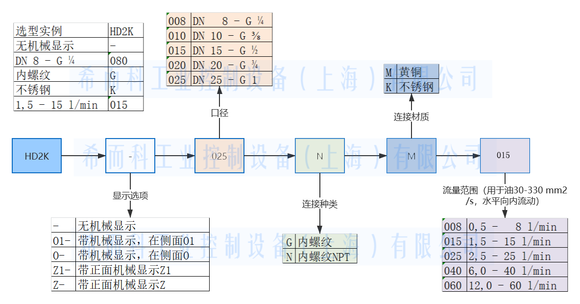 HD2K系列口径从008-025不等,可通过显示选项、口径、连接种类、连接材质、流量范围进行选型。