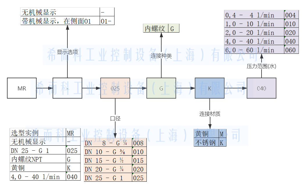 豪斯派克Honsberg 工控产品 流量开关/Flow Meter MR系列产品,选型可以根据产品的口径、显示选项、连接种类、连接材质和调节范围来选择的。口径从008-025不等来看,包括以下参数: