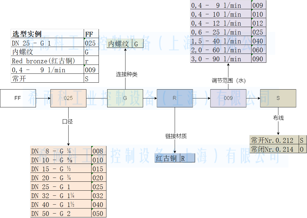 该型号公称直径为DN15 - G 1/2,黄铜外壳,母螺纹连接,介质为水的时候,开关点流量范围为 0.4...9 L/min,接线方式采用 NO.0.212常开方式。