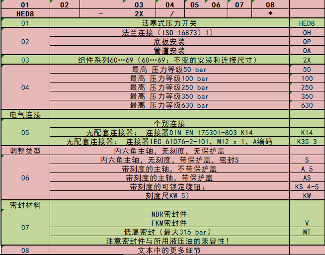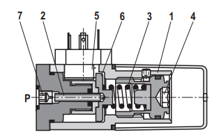 8型水力压力开关是一个活塞型压力开关。 它主要由外壳(1)组成,带活塞(2),压缩弹簧(3)的安装套件调节元件(4)和微动开关(5)如果要监视的压力低于设定压力,微型开关(5)被操作。 待监控的压力通过喷嘴(7)在活塞(2)处施加。 的活塞(2)由弹簧板(6)支撑并起作用克服压缩弹簧(3)的连续可调力。 弹簧板(6)将活塞(2)的运动传递到微动开关(5)上并达到设定压力后释放后者。 这个取决于电路设置。 弹簧的机械限位器板(6)在突然发生的情况下保护微动开关(5)机械破坏造成的压降,以及超压会阻止压缩弹簧(3)的牢固压缩