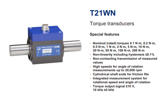 HBM 作为全球首家数字扭矩传感器的制造商,产品包括 扭矩传感器 (扭力传感器,转矩传感器), 以及用来测量反作用力的 非转动式 扭矩传感器 (扭力传感器)以及用于扭矩传感器 (扭力传感器) 的各种联轴器 和测量仪表。HBM 拥有 滑环和非接触式信号传输 专利技术,额定测量范围从 0.1 N·m 到 2 MN·m, 额定转速最大到40,000 rpm。